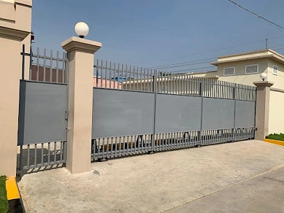 Откатные ворота — это конструкция, которая открывается путем сдвига полотна в сторону вдоль направляющей балки. Такие ворота устанавливаются параллельно фасаду здания и не занимают дополнительного пространства перед въездом. Они отлично подходят для загородных домов, гаражей, коммерческих помещений и складских комплексов.